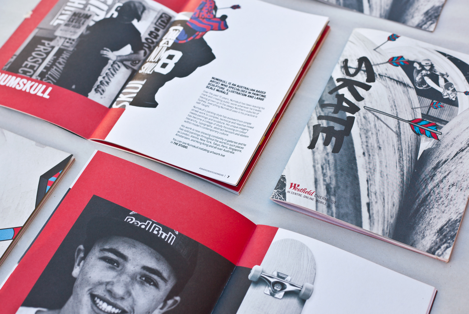 Event magazine for Skate & Create – a skate park and street art activation at Westfield Chermside. Agency: Media Playground Logo: Gemma O'Brien Cover Art: Numskull Photography: Wade McLaughlin